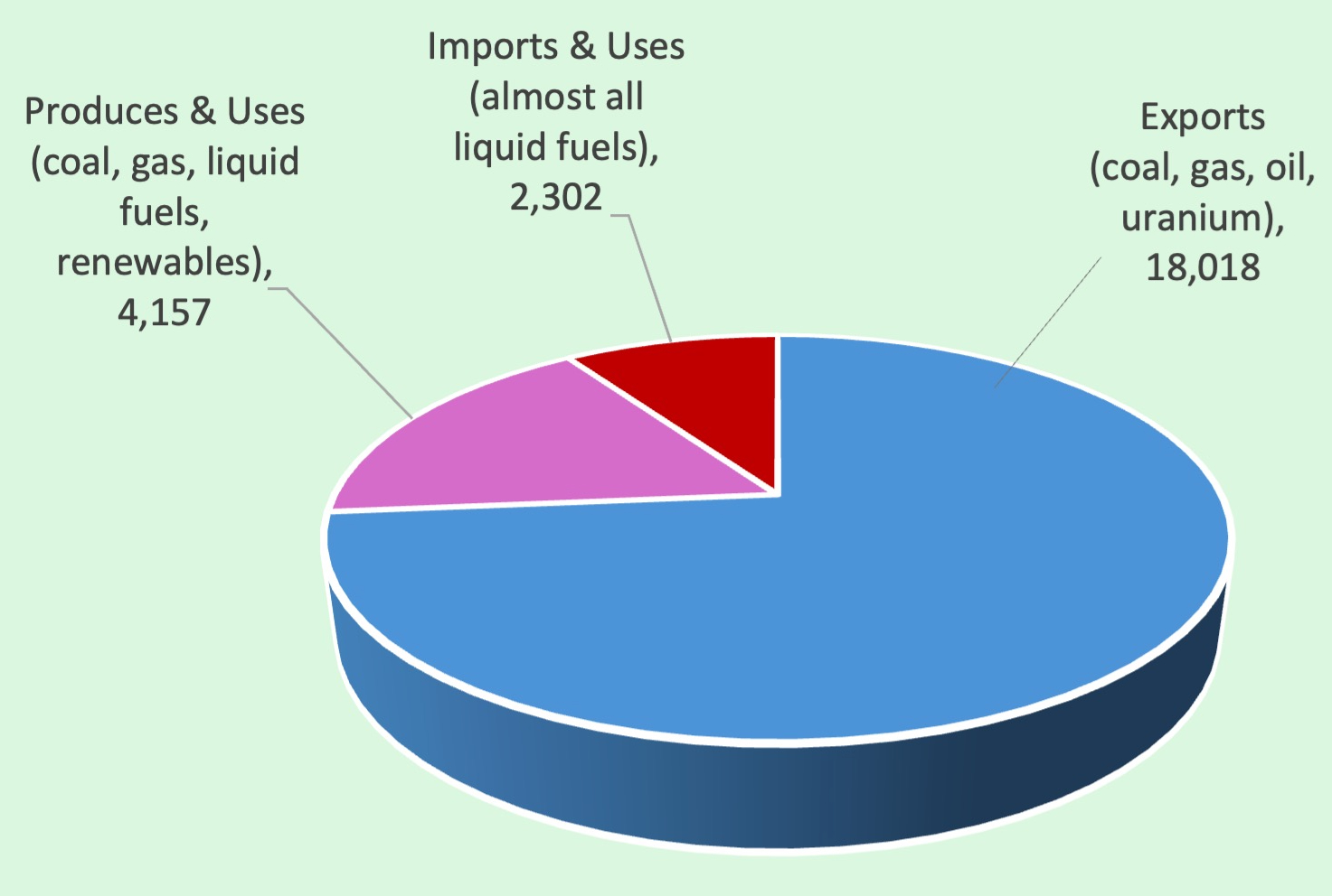 Figure 2 (below) shows that, while Australia produces and uses 4,157 petajoules of energy of many types, and imports and uses 2,302 petajoules of mostly liquid fuels annually, the nation exports a whopping 18,018 petajoules of coal, gas, condensate oil and uranium.