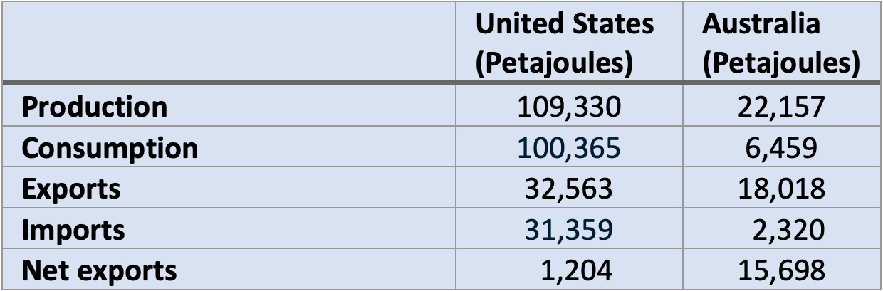 Table 1: U.S. vs Australian Energy Production, Consumption, Imports and Exports